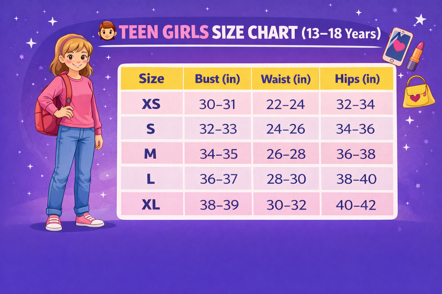 👧 TEEN GIRLS SIZE CHART (13–18 Years)